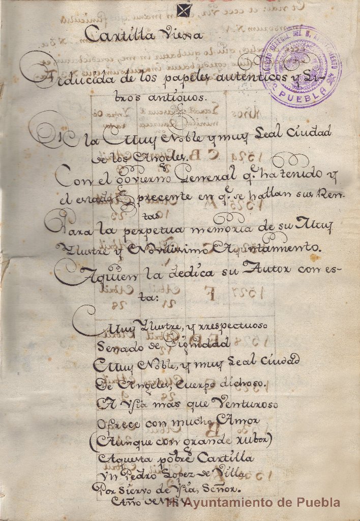 La cartilla esta organizada en sus primeras fojas en forma temática, posteriormente viene un índice por año y asunto, haciendo referencia del libro y foja en el que se encuentra la información, abarca los años de 1533 a 1731; cuenta también con una lista de los vecinos que poblaron la ciudad desde 1533 a 1629 en orden alfabético, otra lista de los regidores del cabildo por año, contiene también un "Extracto de la más particular", el cual trata de un índice por tema de los primeros libros de cabildo.