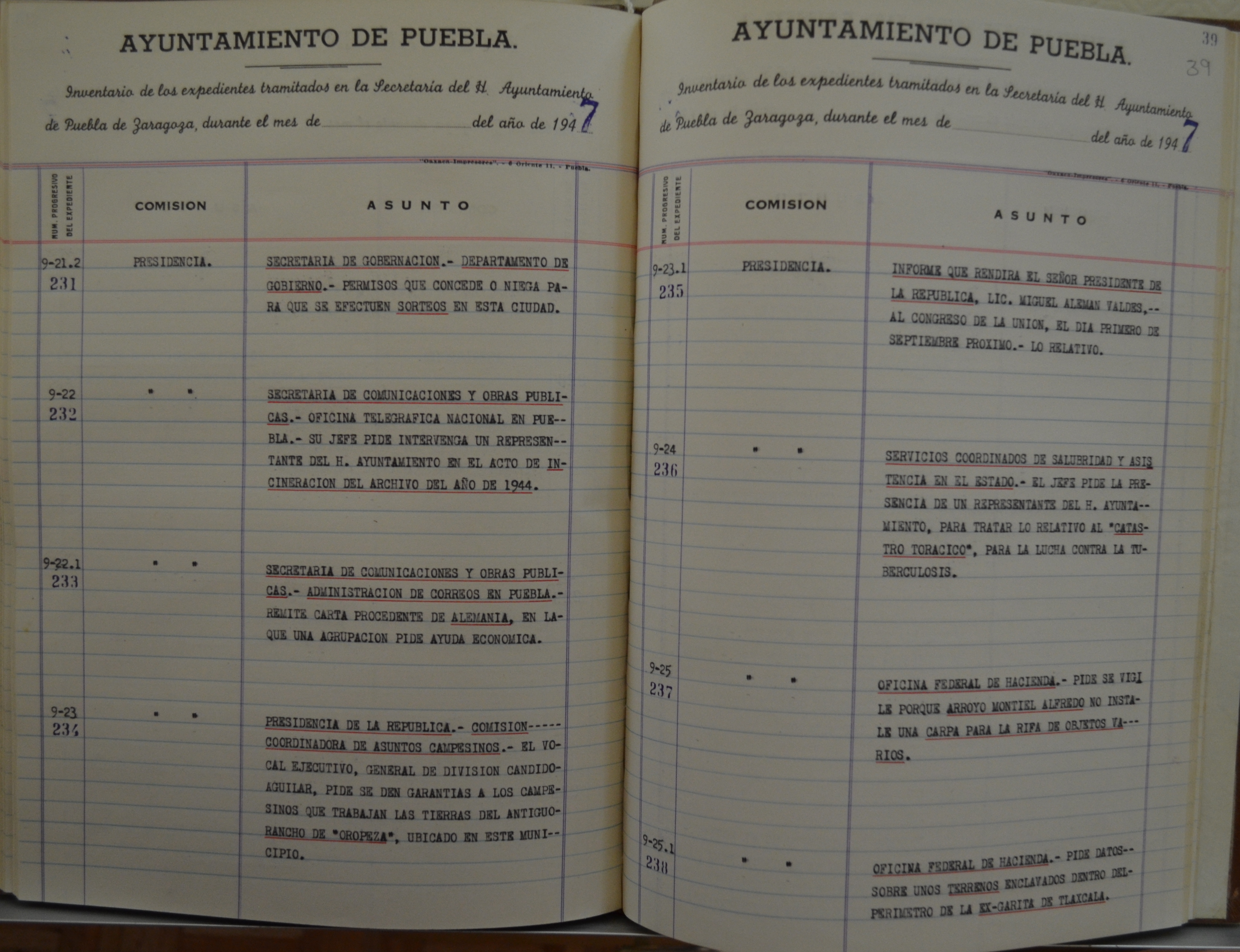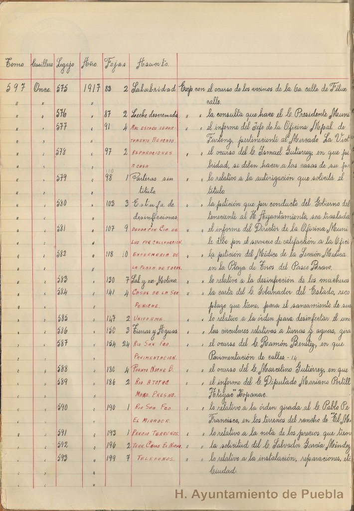 Algunos de estos índices vienen organizados de acuerdo a las secciones que conformaron el Ayuntamiento en diferentes épocas (por ejemplo: sección político-administrativa de la Secretaría General), jefaturas, comisiones, departamentos, etc, algunos otros indican de manera genérica el inventario de los expedientes tramitados en la Secretaría General.