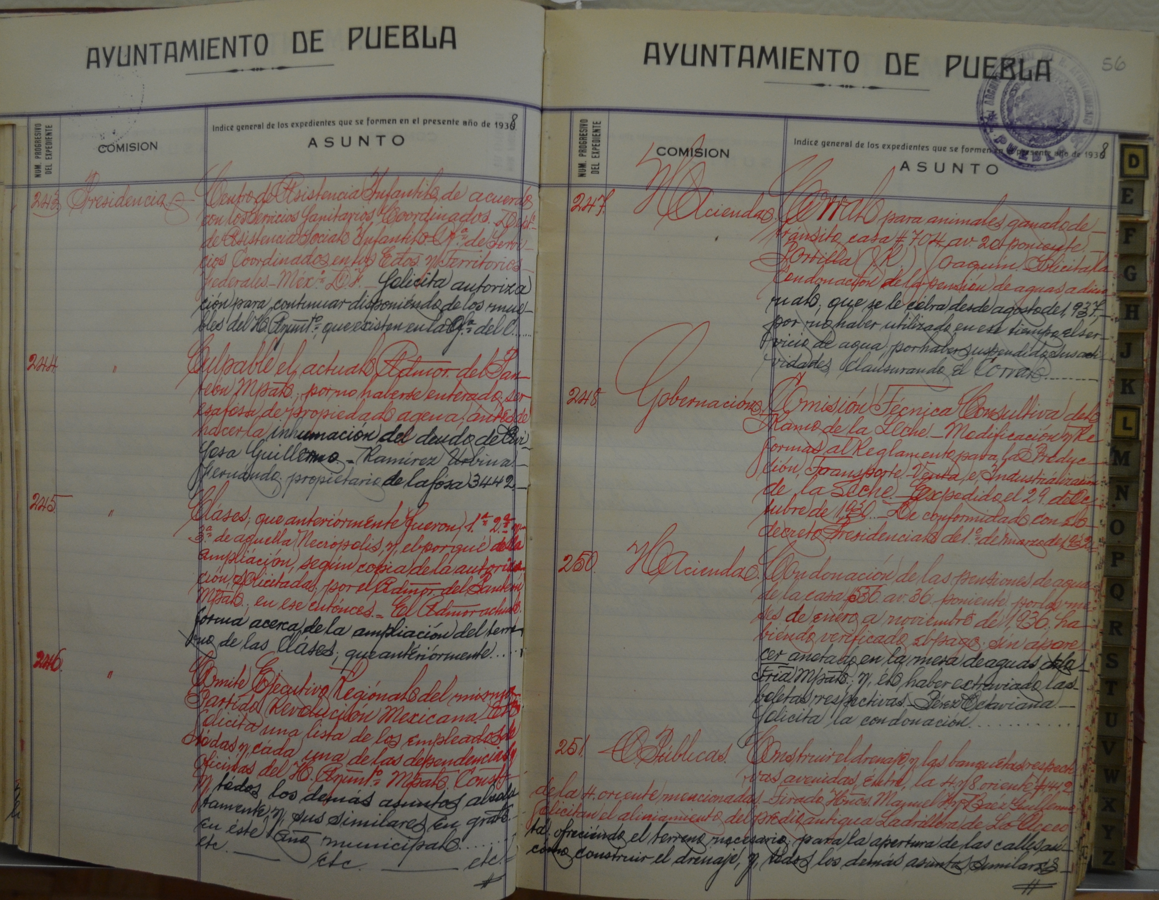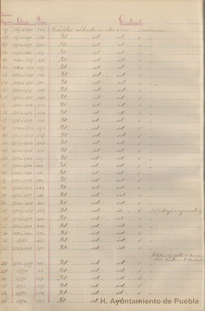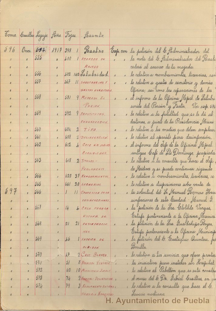 Se trata de documentación manuscrita relativa a los índices de los volúmenes que conforman la sección de expedientes, donde se consignan los siguientes datos: volumen, año, número de legajo, asunto y descripción.