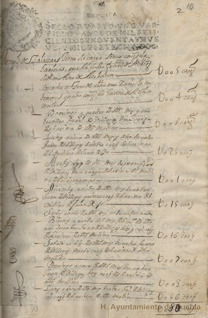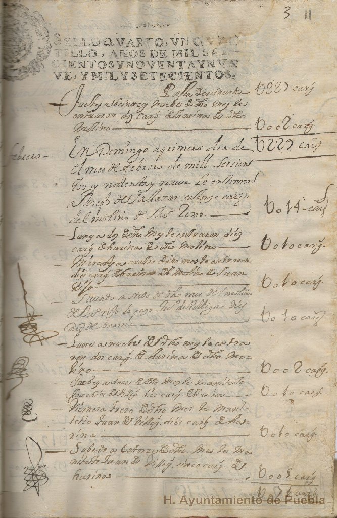 La serie contiene documentación relativa a los informes de la entrada de trigo y harina, así como de las boletas entregadas por el alcalde de la alhóndiga sobre las ventas diarias de maíz; contiene además, un índice con el nombre de las personas que entregaban harina.