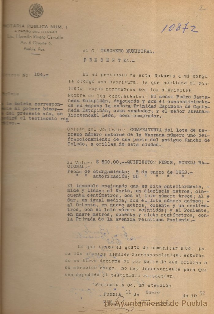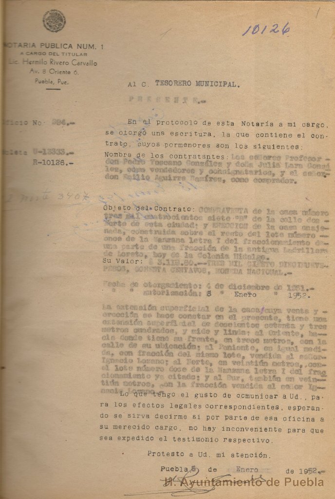Son documentos generados en las varias notarías de la ciudad, en donde el titular enviaba un oficio al tesorero municipal notificándole del otorgamiento de una escritura de contrato, con los datos de las personas que intervinieron en la misma, el objeto del contrato, ubicación y el valor. La comunicación la realiza el notario en espera que la Tesorería Municipal le informe sobre la existencia de algún adeudo para poder efectuar la expedición del testimonio respectivo. Cada volumen contiene los oficios de contestación enviados por el tesorero municipal al notario, donde le informa la situación del bien objeto del contrato respecto a los pagos por concepto de pensión de agua potable.