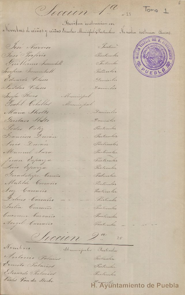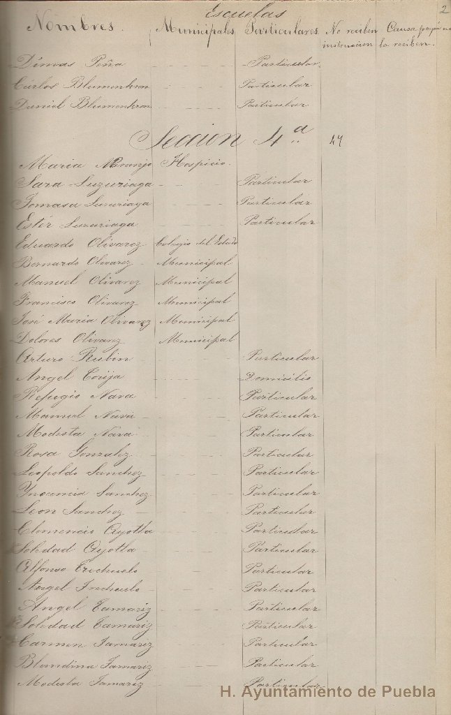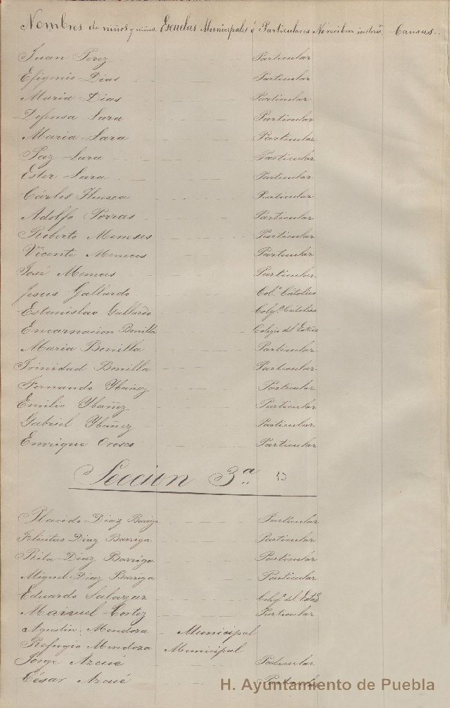 - Registro de niños y niñas que reciben instrucción en escuelas municipales y particulares, que contiene datos como: nombre del alumno, nombre de la escuela municipal, nombre de la escuela particular, si no reciben instrucción y las causas, que por alguna razón carece de fecha.