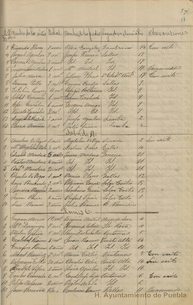 - Registro de vacunas de 1907 donde quedó asentado el nombre del niño, edad, nombres de sus padres y domicilio.