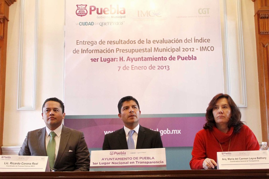 El Presidente Municipal de Puebla, Eduardo Rivera Pérez, recibió por parte del Instituto Mexicano para la Competitividad (IMCO), la constancia que acredita al municipio de Puebla por haber obtenido el Primer Lugar a nivel nacional en materia presupuestaria, ya que por primera vez se ha alcanzado una calificación de 100 puntos, debido a que se incorpora en su desglose de deuda pública: institución bancaria, interés, vigencia y saldos.