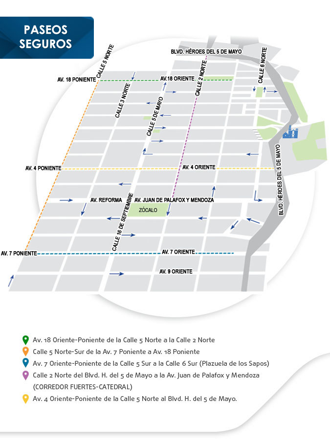 El Ayuntamiento de Puebla promueve el uso de la bicicleta a través del “Plan de Regeneración y/o Redensificación Urbana de la Zona de Monumentos y su entorno en la Ciudad de Puebla”, con la construcción de “Paseos Seguros”, que incluyen la ampliación de banquetas y la construcción de infraestructura vial ciclista (ciclovías, ciclocarriles y/o carriles compartidos ciclistas).